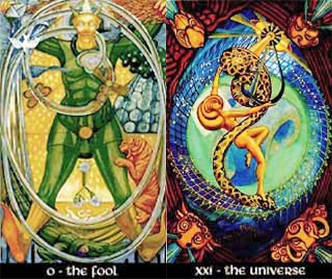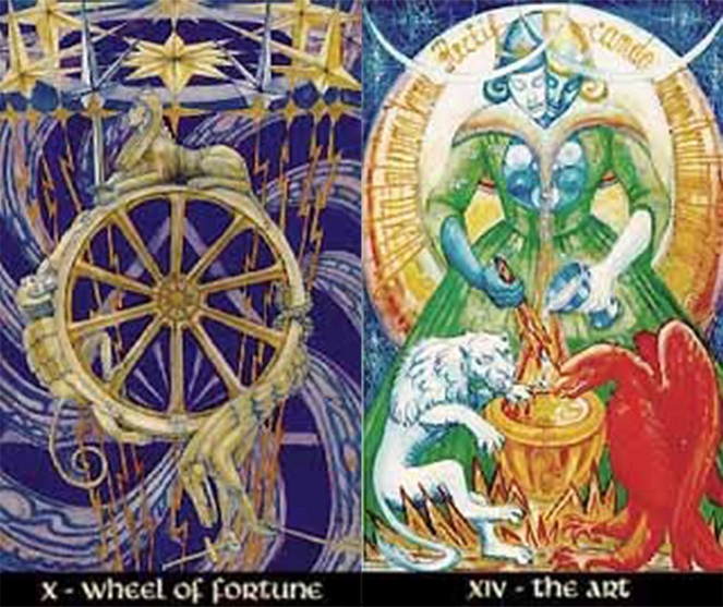 Crowley aveva pure cambiato la definizione ai Denari, divenuti Dischi, e alle Carte di Corte chiamandole Cavaliere, Regina, Principe e Principessa, oltre che l’appellativo di alcuni altri Trionfi, attribuendo quello di Universo al Mondo XXI, di Arte alla Temperanza XIV e di Fortuna alla Ruota X. (figura 12).