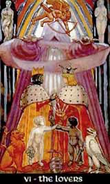 A questo punto, l’Arcano numero VI, Gli Amanti, (figura 11) che rappresenterebbe Ercole al bivio, oppure, come dichiara Crowley, le Nozze chimiche di Rosenkreutz, - attribuendo il risalto dovuto all’occulto significato erotico-cabalistico de ”il Giusto tra due donne”, per come tramandato sia dalla tradizione sufi che dallo Zohar, - in questa visione thelemica, avrebbe potuto degnamente rimarcare entrambi i nodi astrologici creati dai Trionfi XVIII (Pesci) tra IV (Ariete) e XVII (Acquario) e da IX (Vergine) tra XI (Leone) e VIII (Bilancia).