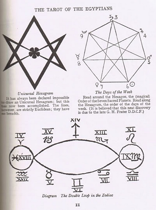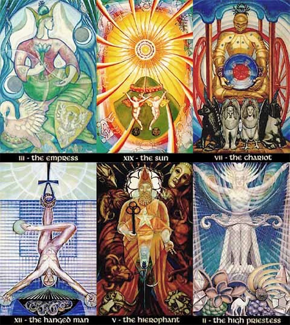 Come l’acquaiolo dello zodiaco, nei “suoi” Tarocchi riversò l’intero contenuto della sue conoscenze (e mentalità) magiche, incorporandovi pure le scoperte più recenti della Scienza, dalla matematica all’antropologia. I Tarocchi, del resto, erano stati per lui una compagnia quotidiana sin dall’epoca dell’iniziazione (18 novembre 1898), con il nome mistico di Frater Perdurabo, all’Ordine Ermetico della Golden Dawn e alla Societas Rosicruciana in Anglia, i quali gli offrirono un approccio sistematico ed estremamente lucido alla Tradizione dei Misteri appartenenti alla cultura occidentale. I Tarocchi giocavano un ruolo preminente nell’ambito degli studi, nella meditazione e nel corso dei rituali di un’organizzazione di cui facevano parte illustri personaggi, tra cui non soltanto il teosofo e massone William Wynn Wescott (1848-1925), il mistico Arthur Edward Waite (1857-1942), o gli occultisti S. L. MacGregor Mathers (1854-1918) e Paul Foster Case (1884-1954), ma anche noti letterati come il poeta W. Butler Yeats (1865-1939), o lo scrittore gallese Arthur Machen (1863-1947), assieme ovviamente a tanti altri.