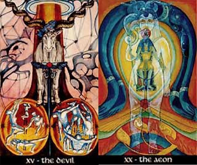 Ebbene, i confini del dettato della Volontà sono sempre abbastanza incerti. E questo concetto viene espresso nei Trionfi XIV e XV che potrebbero essere interpretati come la giusta misura (Arte ed Equilibrio) e la dismisura (ciò che invece è diabolico, come la perseverazione nell’errore). A ciò forse si sarebbe riferito Alan Watts (1915-1973) nel tratteggiare l’esperienza di vita di Frater Perdurabo: “Le figure grandi e potenti, nel senso religioso, vengono senza eccezione considerate divinità dagli uni e diavoli dagli altri”.