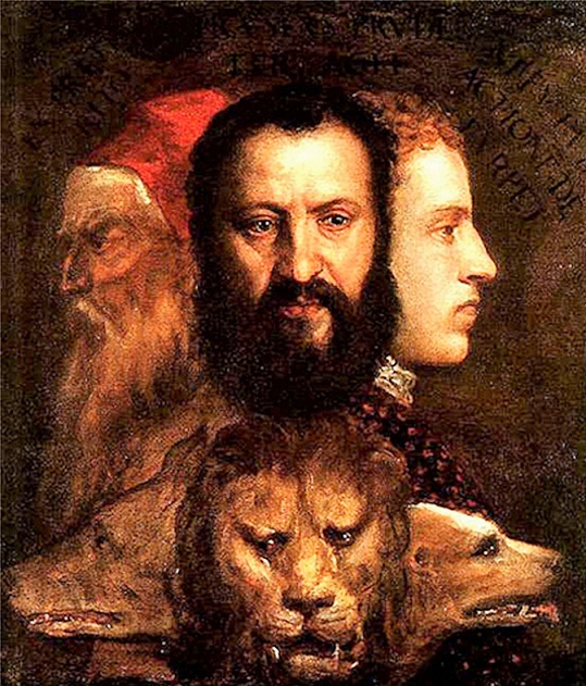 In verità, a parte l’eccezione (quasi sicuramente voluta) delle tre versioni del Mago (figura 2), non si conoscono raffigurazioni multiple tra gli originali della Harris. Difatti, quando l’incaricato della loro riedizione del 1986, Werner Ganser, nel Warburg Institute di Londra, si accorse che, invece di essere settant’otto, come ci si sarebbe aspettati di norma, i disegni depositati erano ottanta. Si interpretò la presenza delle due carte soprannumerarie, e apparentemente superflue, collegandole alla numerologia dei Re Magi della cometa di Bethlemme, ovvero alla trinità alchemica di Nigredo, Albedo e Rubedo, ma si sarebbe potuto fare riferimento anche all’allegoria tizianesca della Prudenza (figura 3), o chissà cos’altro ancora.