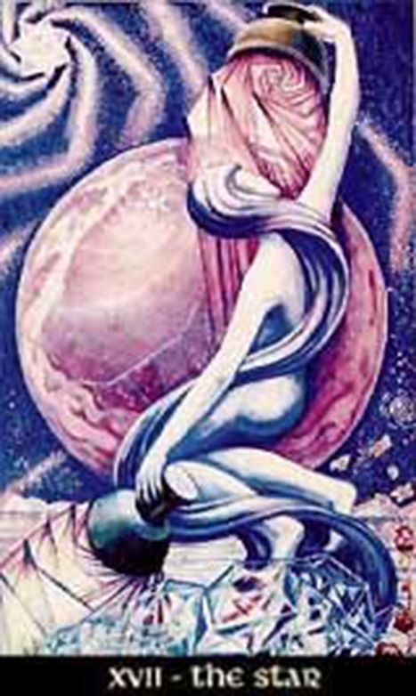 La Stella, per Crowley, rappresenta Nuit, il cielo stellato. “Io sono l’infinito spazio, e le Infinite stelle che vi si trovano” si legge al versetto 22 del primo capitolo del Liber Legis. La descrizione che ne fa è con i due tradizionali vasi, uno che versa acqua simbolo di Luce su di sé, mentre l’altro la versa contemporaneamente sulla terra, quale metafora di una superiore “Economia dell’Universo”, che continuamente spande energia e continuamente la riassorbe, ma anche quale glifo del “Moto Perpetuo”. (figura 4)