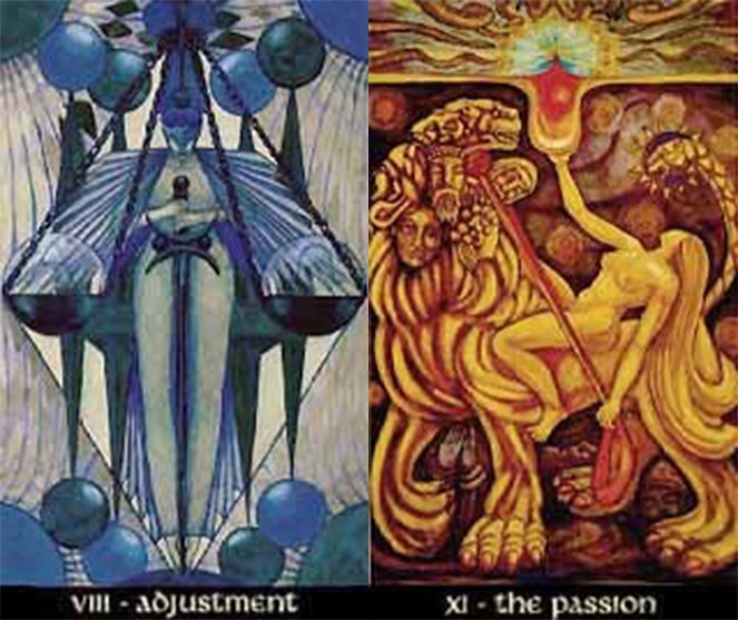 Anche gli Arcani numero VIII (Giustizia, Adjustment) e XI (Forza, Passion) (figura 6) vanno scambiati di posto, in quanto il primo è collegato alla Bilancia, per le rappresentazioni simboliche in esso contenute, e sull’altro compare un Leone. Cosicché Acquarius e Aries si trovano ai lati dei Pisces, alla stessa stregua di come Leo e Libra incorniciano Virgo. La correzione suggerita da Aiwass nel Liber Legis forniva una simmetria perfetta alle attribuzioni zodiacali di queste Lame.