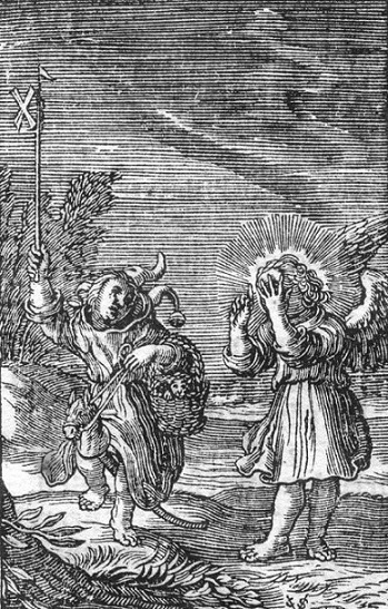 The Fool’s laughter, which we find on the card of the so-called Charles VI Tarot and that of Ercole I d’ Este, is “facilmente indicio di pazzia, secondo il detto di Salomone; però si vede che gli uomini reputati savij, poco ridono, & Christo N.S. che fù la vera saviezza, & sapienza, non si legge, chi ridesse giamai” (easily evidence of madness [pazzia], according to the words of Solomon; however, one can see that men considered wise rarely laugh, and of Christ Our Lord, who was true wisdom and knowledge, we never read that he laughed) (16). An anonymous engraving of the 16th century shows a fool laughing before an angel, who covers his eyes with his hands in order not to see such an unconscionable deed (figure 9).