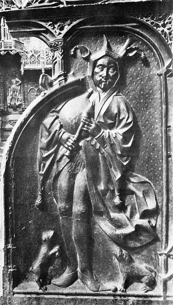 A further example is a mad jester at the 15th-century Church of Santa Maria la Real in Najena, where he shows himself with his robe open at the front, wanting to show what others hide and playing a bagpipe. Two dogs are at his feet (figure 20). On the other hand, the presence of the dog relates the jester-fool with the poor man, thus creating a bridge between the two iconographic variants.
