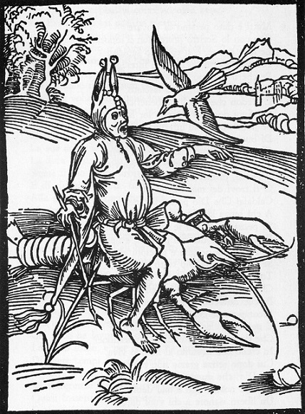 In the so-called Tarot of Charles VI, the Fool wears a cap with huge ass ears, thus showing his beastly nature, and wears underwear of an incredibly modern design (figure 12). The image is very much like that of a fool shown in a codex from Bologna dating back to the second half of the 15th century (figure 13) who carries the usual stick, but in such a way that it seems to cut through the palm of his hand (an allegorical relationship to the stigmata of Our Lord), as can be seen more clearly in a woodcut in the above-mentioned work by Brant. The presence of a reed, which has the same function as the stick, is justified in this way: “Chi mercede illimitata vuol godere, / L’appoggio di una canna potrà avere / Fragile e su un grosso gambero sedere)” (He who wishes to enjoy without limits, will have but the support of a fragile reed, sitting on a great lobster (28). If the reed that pierces the fool's hand satirizes the attitude of the person who in seeking at all costs material well-being does not take into account the possibility of procuring suffering, his sitting on a lobster unites the fool with the crustacean considered inconstant, because it walks as easily backwards as forward (figure 14). For the same reason that Ripa calls the crab a symbol of irresolutness: it walks as easily backwards as forward. Ripa says, “Il granchio è animale, che cammina inanzi, & in dietro, con eguale dispositione, come fanno quelli che essendo irresoluti, hor lodono la contemplazione, hora l'attione, hora la guerra, hora la pace”. (The crab is an animal that walks forward and backward, with the same inclination as those who are irresolute: now they love contemplation, but now action, now war, now peace) (29).
