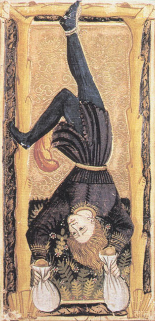 Allo stesso supplizio sembra essere stato condannato Muzio Attendolo Sforza dall’Antipapa Giovanni XXIII che nel 1412 lo denunciò come traditore, per essersi alleato ad un suo nemico, il re di Napoli Ladislao. Nei suoi Annali d’Italia il Muratori scrive che il Papa si sentì tanto offeso che lo fece dipingere impiccato per il piede destro, con sotto un cartello in cui veniva condannato reo di dodici tradimenti”. Una più dettagliata informazione ci giunge dalle cronache del tempo: “Per ordine del Signor nostro Papa fu dipinto su tutti i ponti e su tutte le porte di Roma, sospeso pel piede destro alla forca, quale traditore della Santa Madre Chiesa, Sforza Attendolo e teneva una zappa nella mano destra, e nella mano sinistra una scritta che diceva così: Io sono Sforza vilano de la Cotignola, traditore, che XII tradimenti ho facti alla Chiesa contro lo mio honore, promissioni, capitoli, pacti aio rocti” (4). Questo resoconto risulta importante per il numero delle colpe attribuite che corrisponde a quello del traditore nelle carte dei tarocchi. Chi promosse questa azione sapeva che il popolo avrebbe immediatamente collegato quel numero a qualcosa che conosceva, per cui dobbiamo domandarci se il XII, oltre ad indicare il dodicesimo apostolo cioè Giuda, non rispecchiasse già l’immagine dell’Appeso presente nei tarocchi. Se ciò fosse, sarebbe stato di gran lunga più facile per il volgo l’immediato riconoscimento.