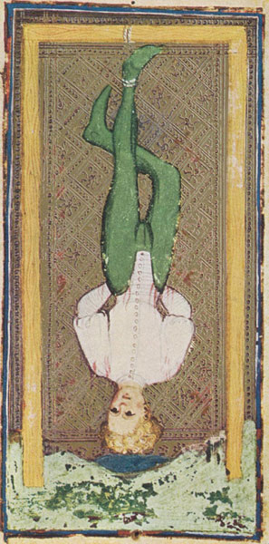 La figura della carta dodicesima mostra, nei primi esempi miniati, un uomo appeso per un piede ad una traversa di legno. Nel cosiddetto Tarocco di Carlo VI (figura 1) l’uomo tiene in ciascuna mano un sacchetto da cui escono monete, mentre nei Trionfi dei Visconti (figura 2) le mani sono legate dietro la schiena. Ritroviamo i due aspetti rispettivamente nelle minchiate e nel tarocco cosiddetto classico, con una variante per ciò che concerne le minchiate. Mentre nelle carte di Carlo VI la gamba libera è piegata e ondeggia nell'aria, secondo una postura che ritroviamo per questo tipo di punizione in diverse raffigurazioni dell’Inferno (figura 3 - Giuseppe Salerno, Il Giudizio Universale, 1629, Particolare dell’Inferno, Duomo di Gangi, Palermo. Foto realizzata da Angela Bisesi), le minchiate assumeranno l’iconografia del Tarocco Visconti, con la gamba ripiegata dietro l’altra in modo da formare una croce.