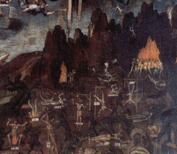 Il peccato dell’uomo è stato rappresentato iconograficamente nell’immagine di una caduta. Per primo Lucifero, seguito da tutta la sua schiera. “L' uomo capovolto, cioè l’uomo che ha perduto lo stato eretto, ha perduto tutto ciò che simboleggia e sottintende lo slancio verso l’alto, verso il cielo, verso lo spirituale, egli non risale più l’asse del mondo in direzione del polo celeste e di Dio; al contrario s’infossa nel mondo animale e nelle tenebrose regioni inferiori” (9).
