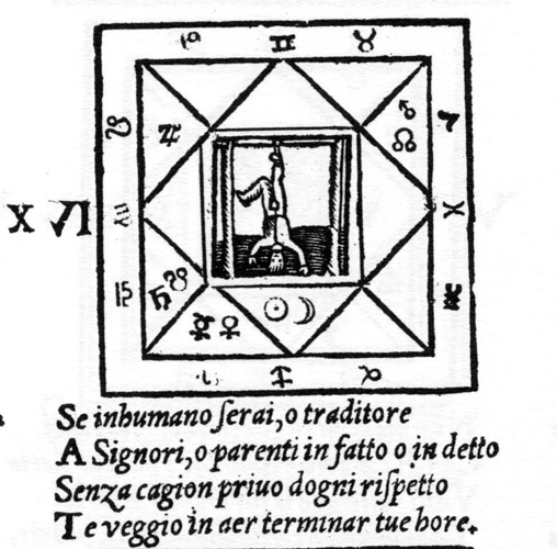 Alla carta LXII v. dei responsi, la Sybilla Cumana così si esprime nella XVI quartina, illustrata dalla stessa figura di un uomo appeso per un piede:”Se inhumano serai, o traditore / A Signori, o parenti in fatto o in detto / Senza cagion privo d'ogni rispetto / Te veggio in aer terminar tue ore” (figura 4) (6).