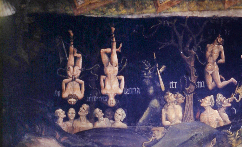 Da parte nostra, già nel 1986  trovammo una figura identica a quella del Tarocco di Marsiglia e della maggior parte dei tarocchi popolari. Essa appare nella Basilica di San Petronio a Bologna nell'affresco dell'Inferno che impreziosisce la Cappella Bolognini, dipinto da Giovanni da Modena nel 1410. Nel suo testamento Bartolomeo Bolognini aveva raccomandato che le immagini delle pene dell'inferno fossero “Orribiles quantum plus potest” e certamente il risultato corrispose all'effetto desiderato. Al centro troneggia un gigantesco diavolo gastrocefalo, secondo l'iconografia tipica del tempo. Fra aspre, taglienti e massicce scaglie rocciose i dannati vengono rappresentati nelle loro pene di contrappasso con la colpa scritta su banderuole, sui sassi e sopra la linea dell’orizzonte. Proprio su questo orizzonte di pece si innalzano, uniche apparenze vegetali, gli scheletrici tronchi e le ramaglie nelle quali sono trafitti o pendono i dannati. Fra questi, due uomini sono appesi per un piede ai rami dello stesso albero: uno è raffigurato di fronte, l'altro di schiena. Le loro teste sovrastano altri dannati, due gruppi di tre persone, immersi nell'acqua fino al petto, che guardano a loro volta le facce degli appesi sovrastanti (figura 5).