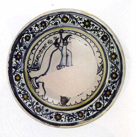 Un’ulteriore testimonianza, definitiva al riguardo dell’essere appesi per un piede come pena comminata ai traditori, si trova in un piatto in maiolica (8) che ho trovato presso la Collezione Ceramica del Museo del Palazzo Malatestiano di Fano (figura 6). Il piatto, frammentario e in parte lacunoso, presenta un’ampia tesa decorata da un tralcio fiorito realizzato in monocromia blu. Ad intervalli regolari, tra le volute sinuose, si inseriscono piccoli fiori con bottone centrale di color arancio. Al centro del piatto campeggia la figura di un uomo appeso, trattenuto ai piedi da una corda, e un cartiglio con iscrizione che corre lungo il perimetro superiore del cavetto. Ciò che resta della scritta poco leggibile all’interno del cartiglio, sono le parole “TRADITURE NO TE C [...]”.