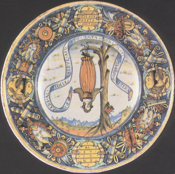 L’essere appesi, per uno o due piedi, in ogni modo a testa in giù, divenne anche raffigurazione allegorica di situazioni negative, causa di dolore e sofferenza morale. Ne troviamo un esempio in un piatto di ceramica italiana del 1510 rappresentante un’allegoria amorosa. Dal ramo di un tronco d’albero secco è appesa per i piedi una donna “per non avere fede sopposta” (figura 7) (10).