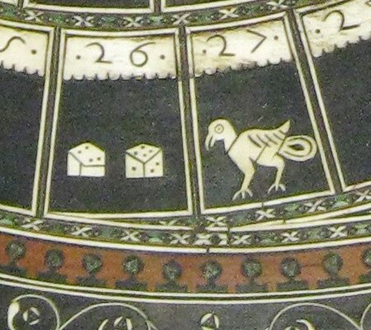 In due caselle (la 26 e la 53), sono segnalate le due possibilità di ottenere il risultato 9 con le diverse combinazioni che le forniscono mediante due dadi (3+6 e 4+5). Mentre la disposizione delle oche nel tragitto, circolare, ellittico od ovoidale che sia, evidenzia ancora una volta la rilevanza nell’intera struttura del settenario, essendo, infatti, sempre alternate tra loro con modalità: 4 caselle-oca-3 caselle-oca [5, 9, 14, 18, 23, 27, 32, 36, 41, 45, 50, 54, 59=XIII], come avviene nei cicli settenari e novenari che contrassegnano la cronobiologia degli anni climaterici (dalla pubertà alla menopausa, terza e quarta età), fondamentali multipli critici nel corso della vita umana.