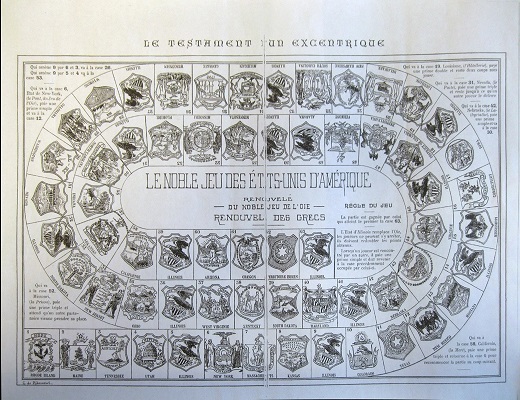 Verne J. Le Testament d'un excentrique, J. Hetzel & Cie, Paris 1899 (figura 4:Mappa allegata a “Le Testament d'un excentrique” (1899) di Jules Verne (1828-1905). Il percorso comprende 50 stati nordamericani disposti in sequenza e uno di essi, che rappresenta l’oca (l’Illin-ois, in assonanza con oies), si ripete 14 volte, in modo da raggiungere il totale delle classiche 63 caselle. Il Ponte è la passerella sulla cascata del Niagara (Stato di New York, Casella 6); l’Albergo/Hotel (Casella 19) corrisponde alla Luisiana; il Pozzo (Casella 31) al Nevada; il Labirinto (Casella 42) è una gigantesca depressione naturale del Nebraska; la Prigione (Casella 52) viene sostituita dal Missouri; e l’arido canyon della California (la Valle della Morte) occupa il numero 58.