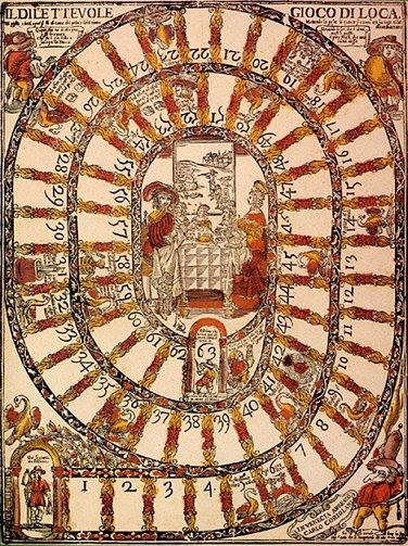 In quanto pellegrino dell’essere, ogni uomo percorre un suo personale itinerario, sia pur con svariate possibilità di fermate e rallentamenti causati da imprevisti impedimenti, cadute rovinose dalle quali rialzarsi a fatica, e persino inutili giri a vuoto. Metafora di tale viaggio può essere considerato il Gioco dell’oca, “ritrovato”, o reinventato, nelle corti europee del XVI secolo [in particolare la spagnola di Felipe II (1527-1598), ma ancor più probabilmente quella medicea, dal cardinale Ferdinando (1549-1609), o forse proprio dal fratello di quest’ultimo, il granduca Francesco I (1541-1587), quindi ben prima della versione iberica], a partire dalla più antica consuetudine combinatoria, in riferimento al lancio dei dadi, per come farebbe supporre il “De ludo aleae” (1520) di Gerolamo Cardano (1501-1576).