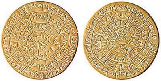 Ben più forte rimane la suggestione del nome stesso dell’eroe euboico, “abile con la palma della mano”, per il richiamo a un’estremità di arto dalle dita congiunte, come da una membrana, a mo’ di pes anserinus, in quanto allegoria di destrezza, ma anche di prodezza e astuzia. La sua invenzione potrebbe essere stata analoga a quel disco di terracotta d’età minoica (1700 a.C.), ritrovato, nel 1908, sulla costa meridionale dell’isola di Creta, nei pressi di Haghia Triada, a Faistós, da Luigi Pernier (1874-1937). Del diametro di ca. 16 centimetri, contiene ben 241 simboli (dei quali 45 unici, e nove originali hapax legomenon, raggruppati in 61 “caselle”, leggibili come “parole”), impressi a stampo, quando l'argilla era ancora fresca, su di uno spessore di ca. altrettanti 16 millimetri, e disposti, su entrambe le facce, in una sequenza a spirale e in senso orario centripeto. (figura 1 : il disco di Faistós)